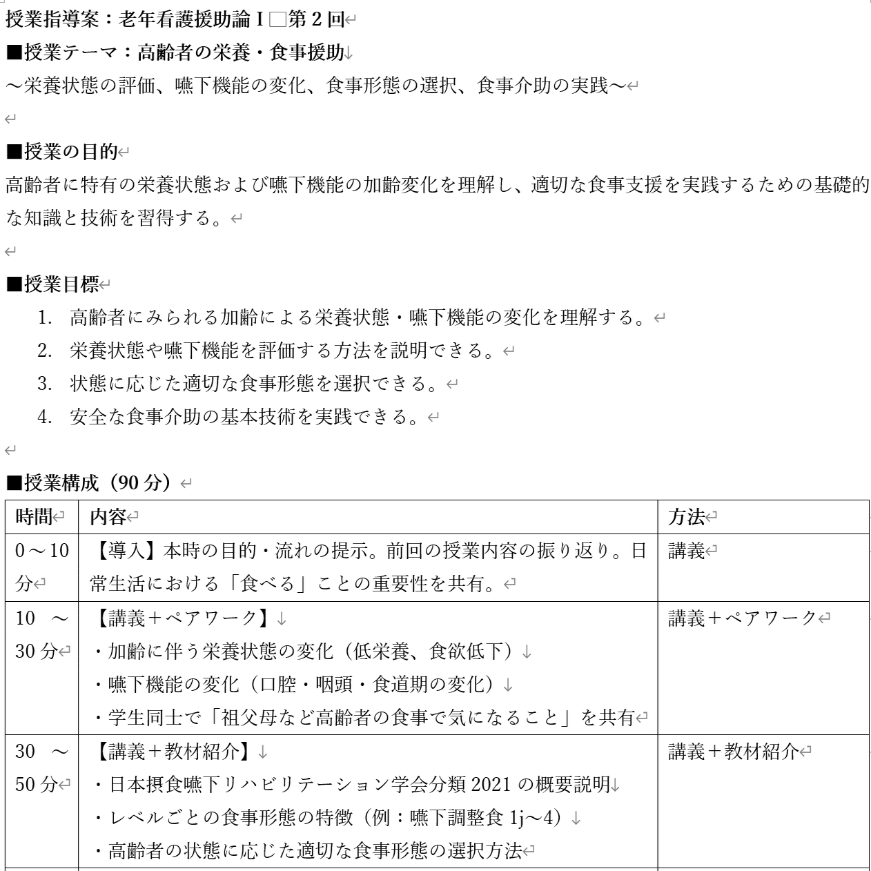 高齢者の栄養・食事援助がテーマの看護教員用の授業案と学生用資料です。