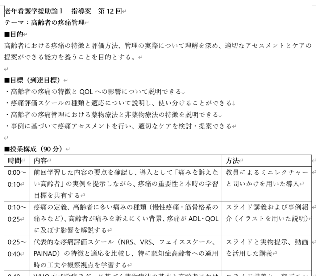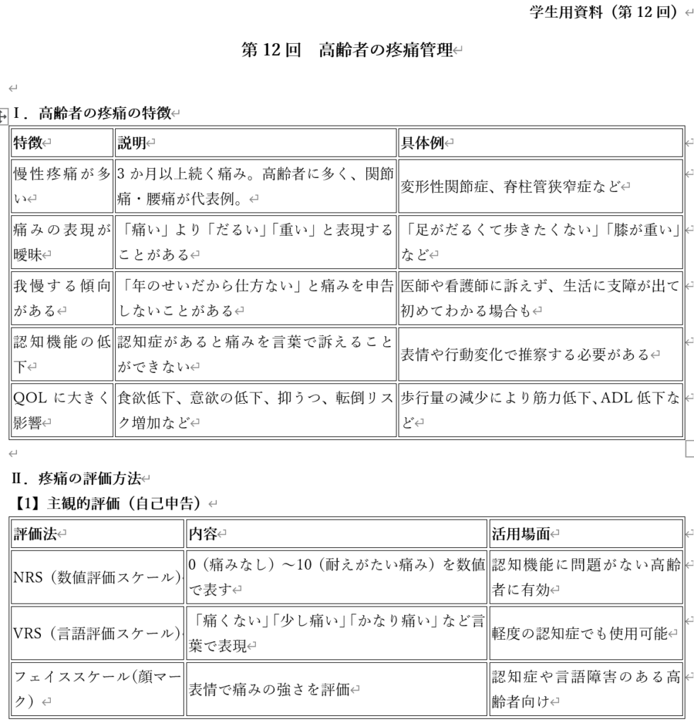 講義で 活用できるWord形式の指導案 & 学生用資料です。看護現場で重要なテーマの一つが「高齢者の疼痛管理」です。年齢とともに複雑化する疼痛の特性を理解し、適切に対応することは、患者さんのQOL(生活の質)を大きく向上させる鍵となります。