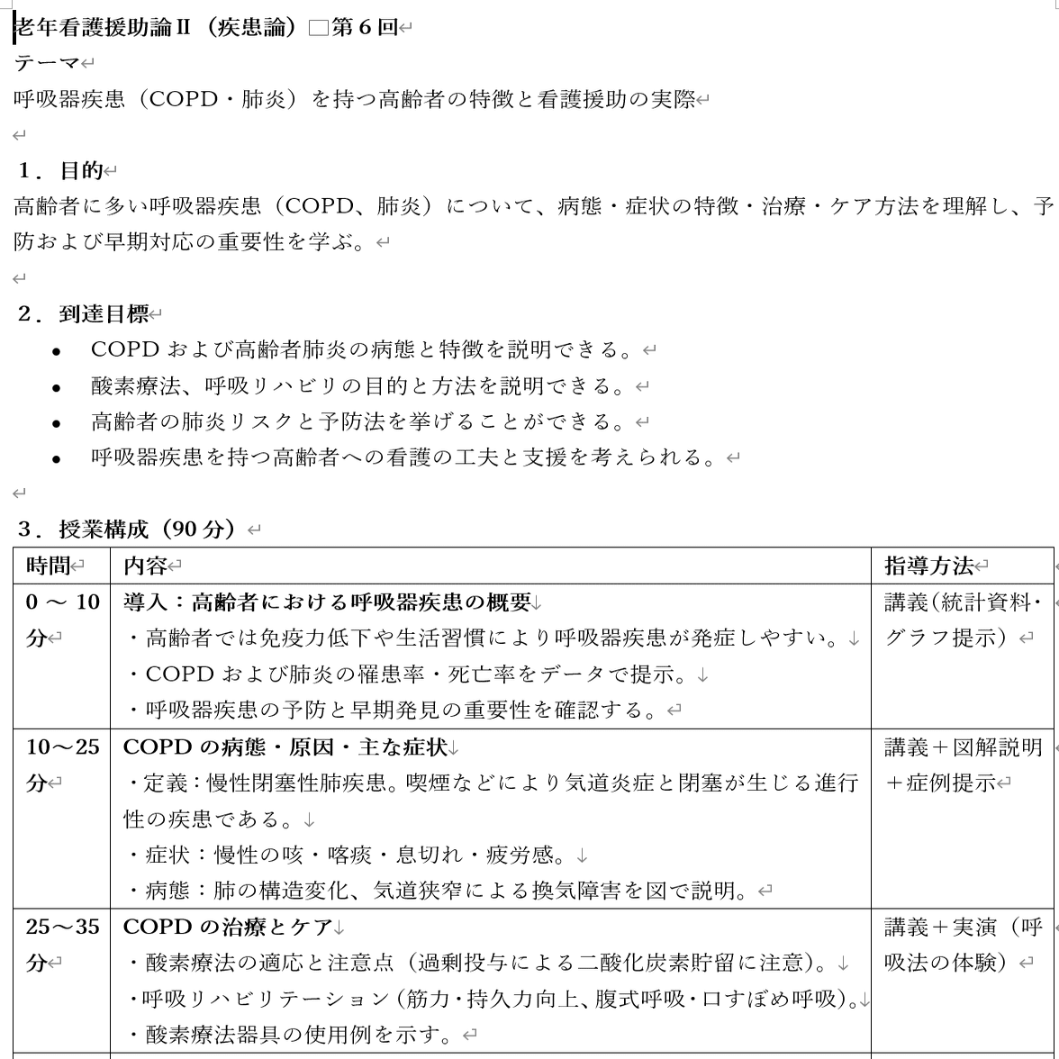 高齢者のCOPDと肺炎がテーマの看護教員用の授業案と学生用資料です。