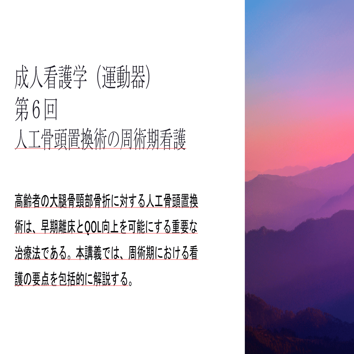 成人看護学Ⅲ(運動器)6回 人工骨頭置換術を受ける患者の周術期看護と退院支援 <看護教員向け:Wordファイル>