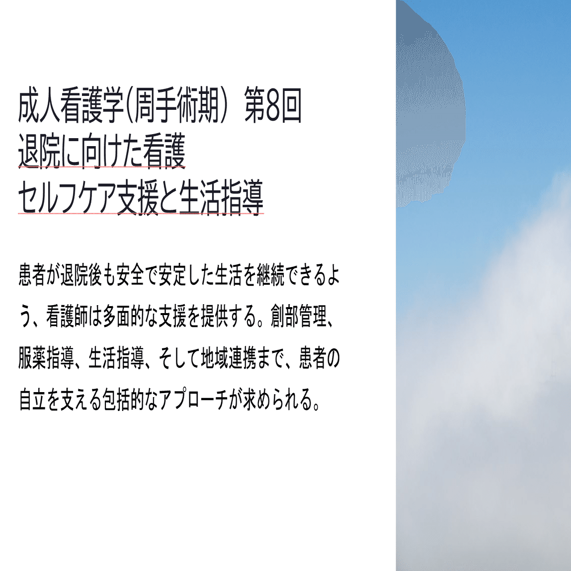成人看護学(周手術期)8回 退院に向けたセルフケア支援と生活指導における看護の役割