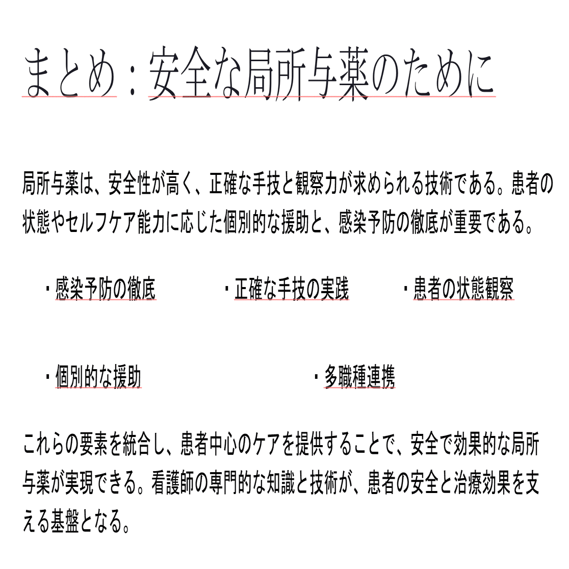 本教材は、AIツールを活用して初稿を作成し、その後、看護教員としての専門的な視点を反映させながら、内容の精査と調整を行っております。効率と質の両立を意識し、現場で実際に使いやすい資料となるよう整えておりますが、ご使用にあたっては、必ずご自身で内容やエビデンスをご確認のうえ、授業内容に適した最終的な調整をお願いいたします。