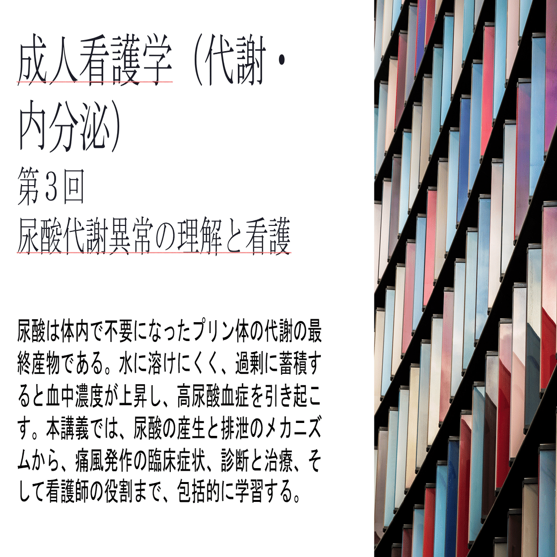 成人看護学(代謝・内分泌)3回 尿酸代謝異常の理解と看護(看護教員用・PowerPoint・全スライド20枚)|看護教員の図書館@授業案ダウンロード
